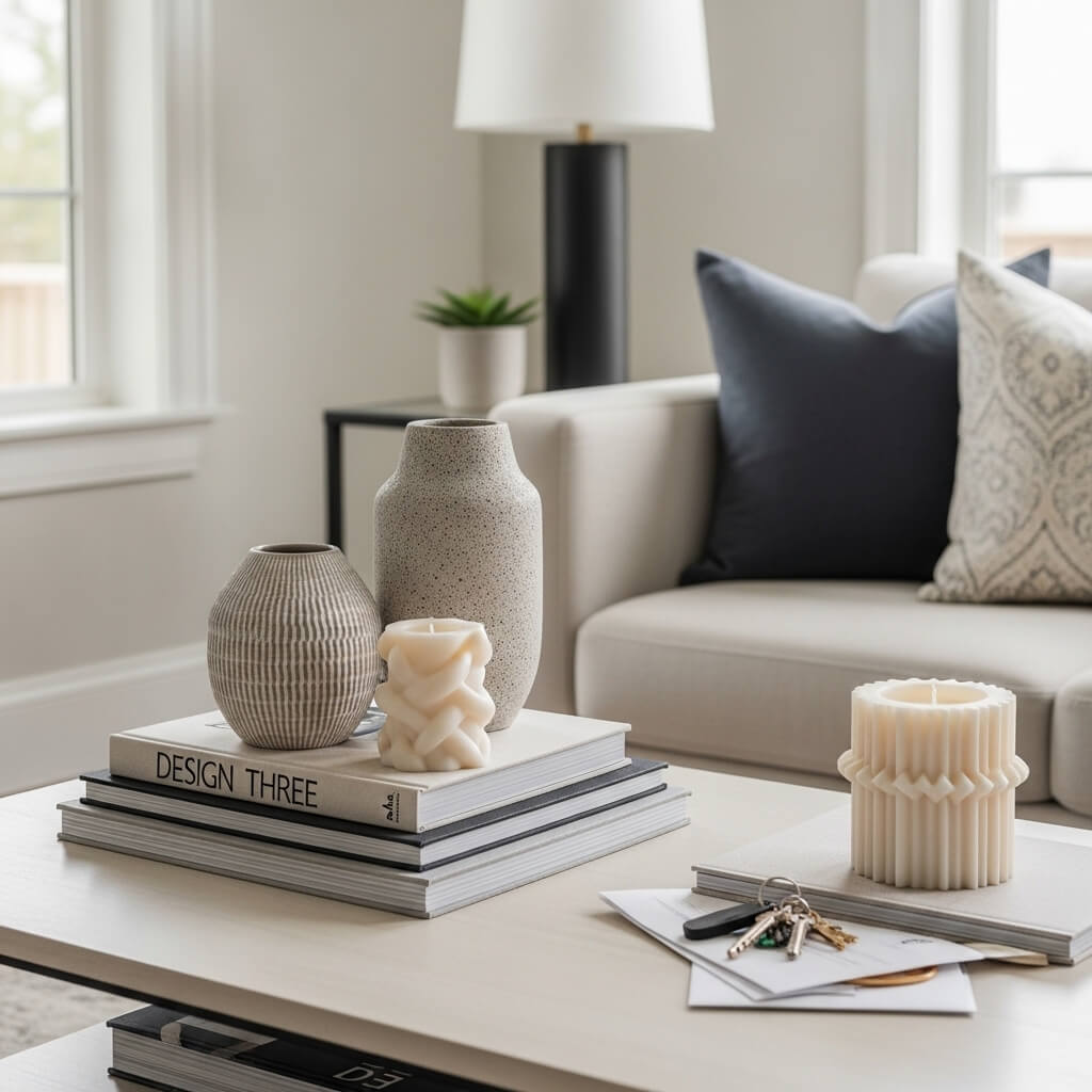 For instance, stack two large design books, add a textured vase, and a sculptural candle.