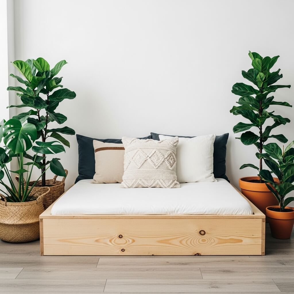- The Curation: Flank the platform with large plants. A towering Monstera Deliciosa in a seagrass basket or a Ficus Audrey in a terracotta pot works well.