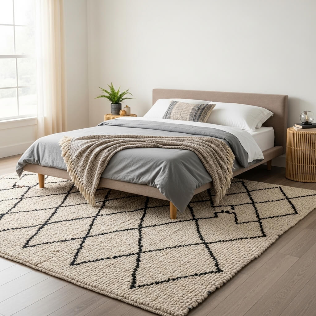 - The Selection: Layer a large, textured rug under the bed. A plush Moroccan Beni Ourain rug or a thick braided jute rug works great.