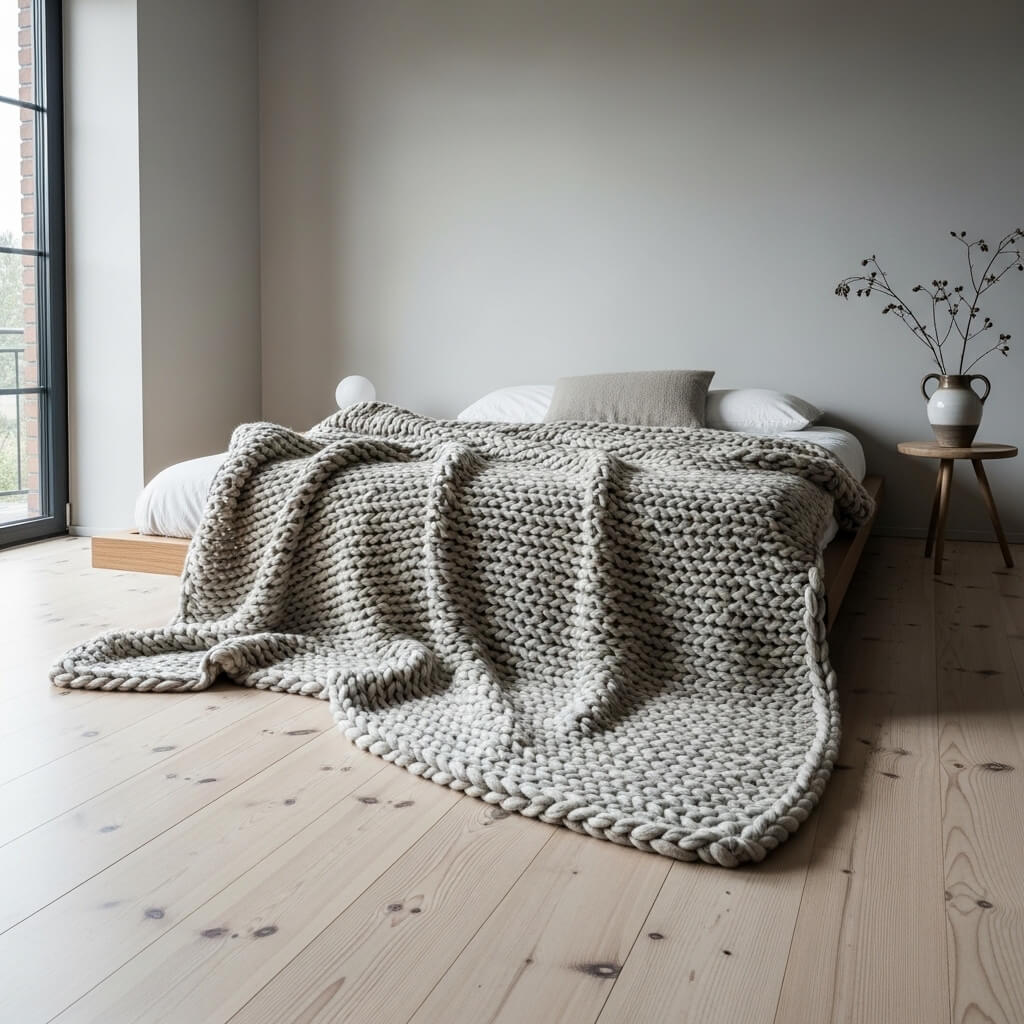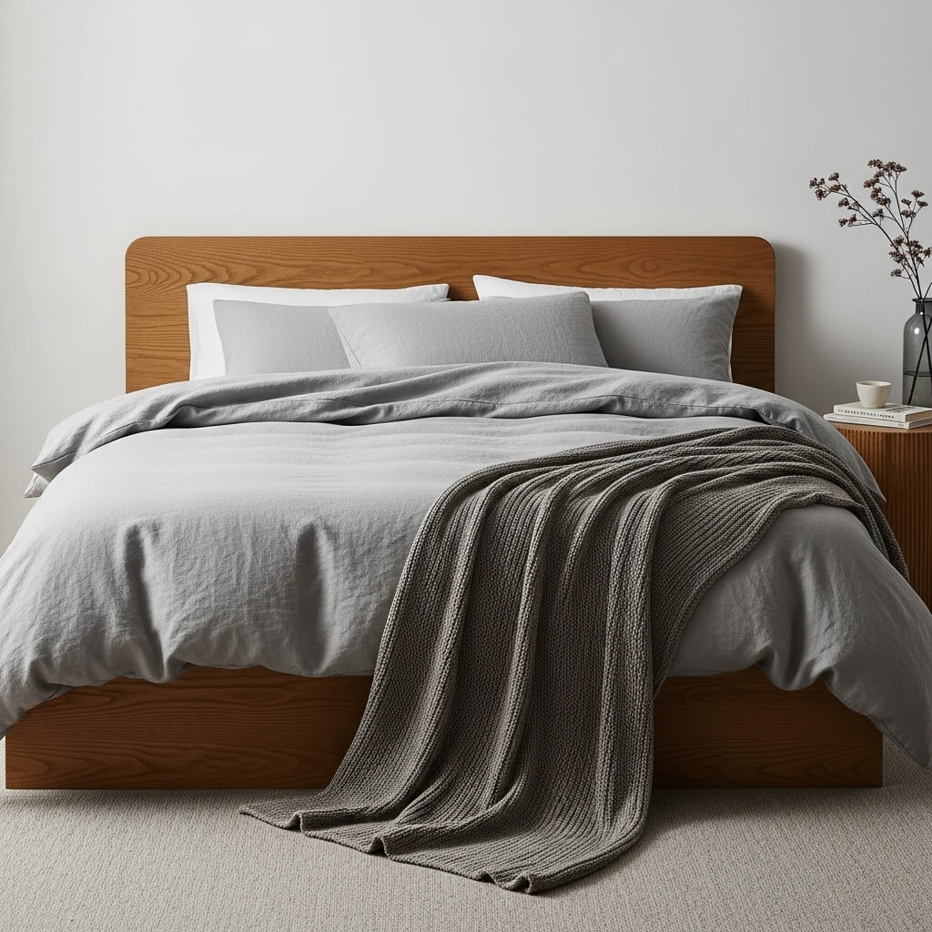- The Accessory: Drape a chunky knit wool blanket across the bed’s lower third, letting it spill onto the wood.