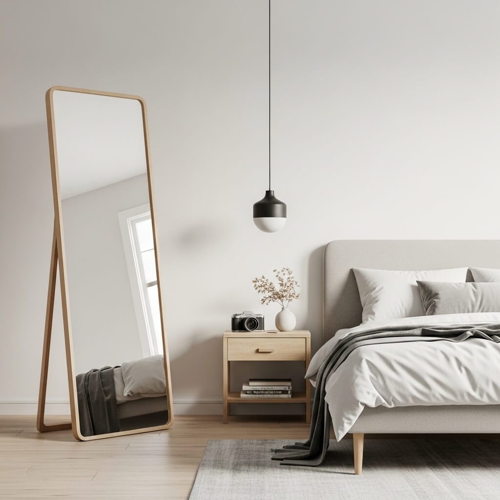- The Placement: Lean a large floor mirror with a thin wooden frame against the wall next to the bed.