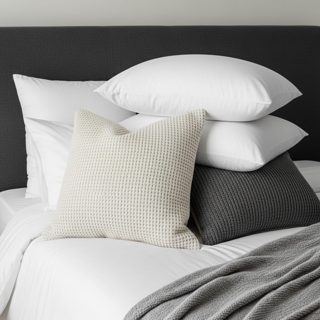 - The Styling Method: Stack sleeping pillows flat and casually toss a few textured throw pillows against them.
