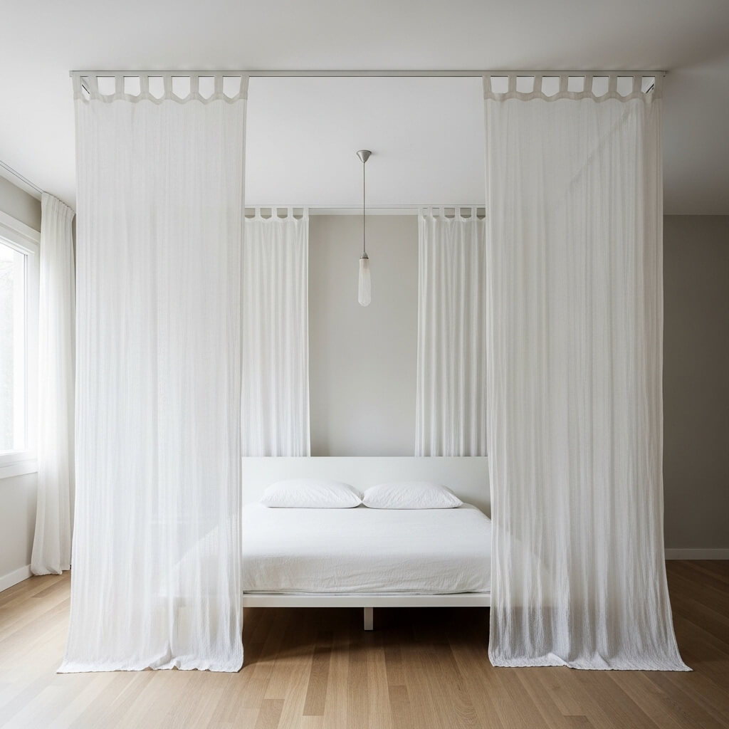 - The High-Low Mix: Install a minimalist track on the ceiling above the bed. Hang sheer white linen or cotton gauze panels that cascade down.
