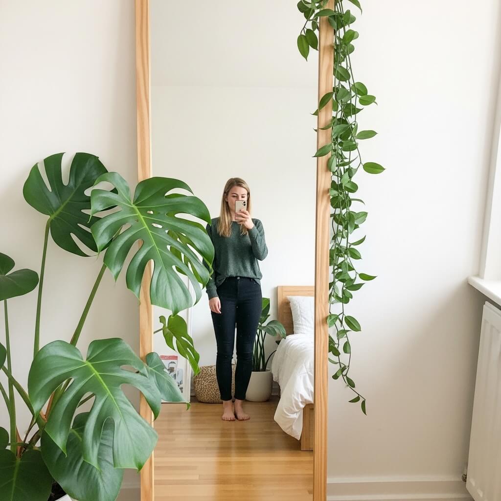 Integrating greenery gives you fresh, organic bedroom mirror selfie inspiration.