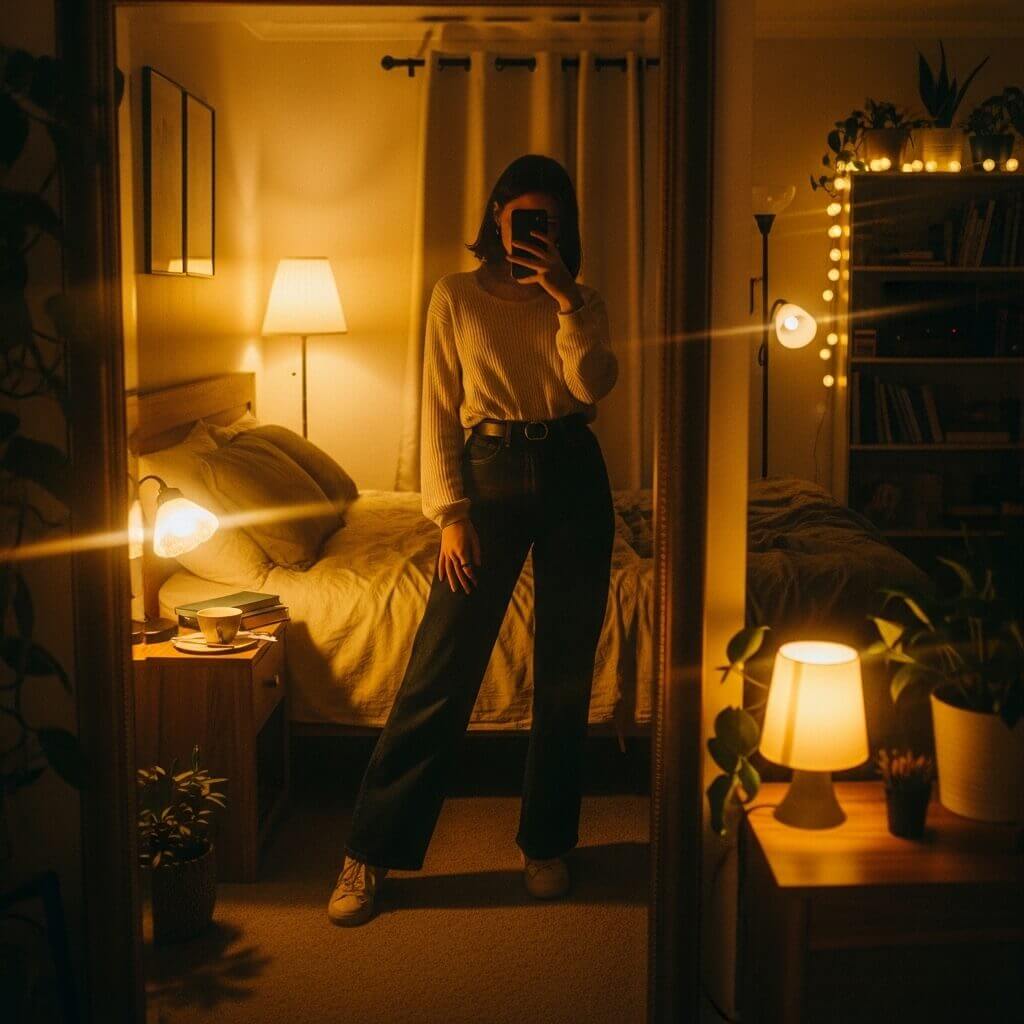I rely on warm ambient lamps to save my late-night outfit checks.