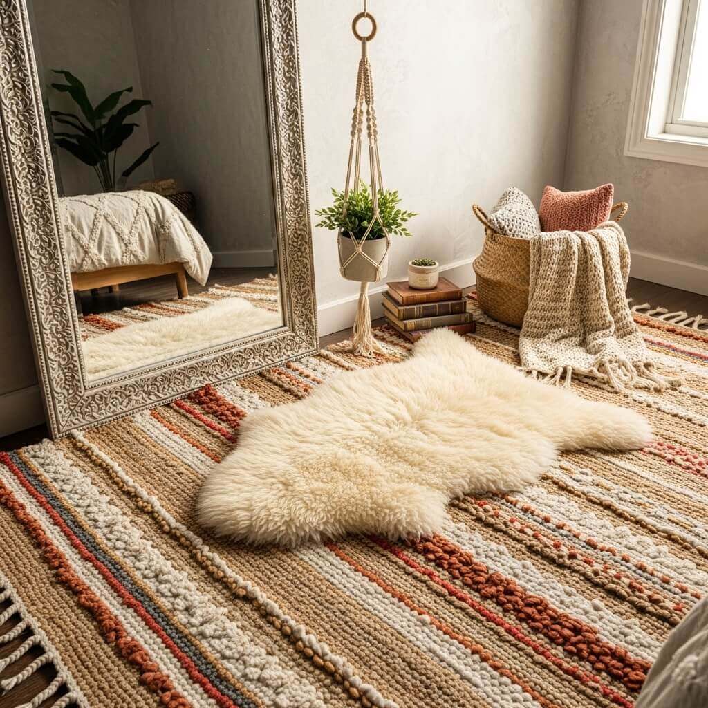 I love layering textured rugs under my mirror to create a cozy, boho-chic vibe.