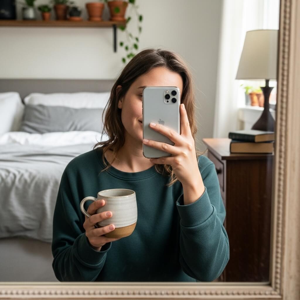 Props give you easy, realistic bedroom mirror selfie inspiration.