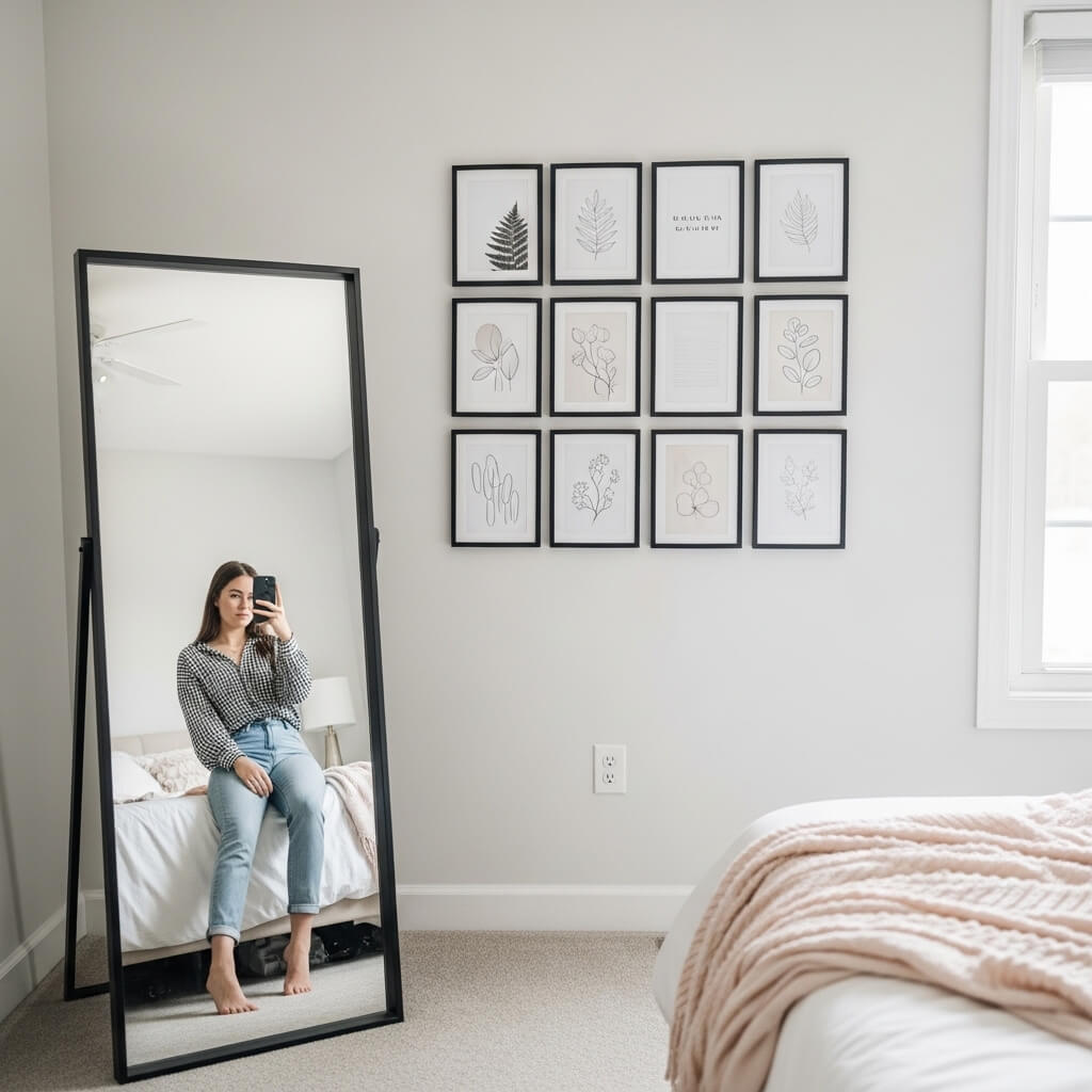 Smart camera placement anchors your bedroom mirror selfie inspiration.