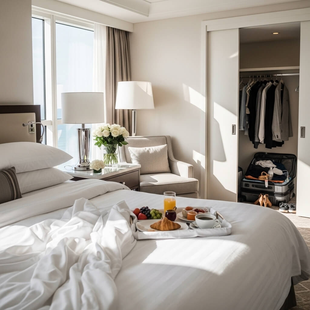 A messy suitcase destroys a luxurious Hotel room aesthetic entirely.