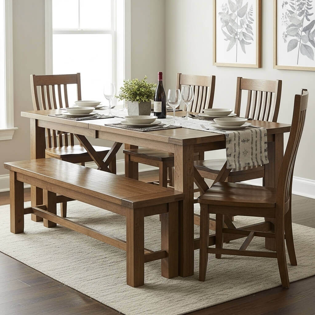 I aggressively mix traditional chairs with a casual wooden Bench.