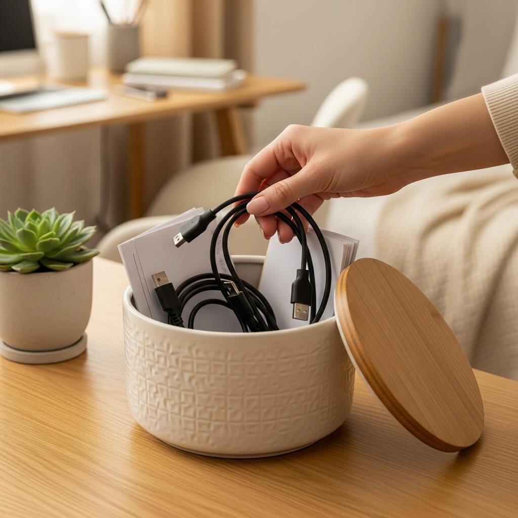 I stash all my random charging cables and ugly paperwork entirely out of sight.
