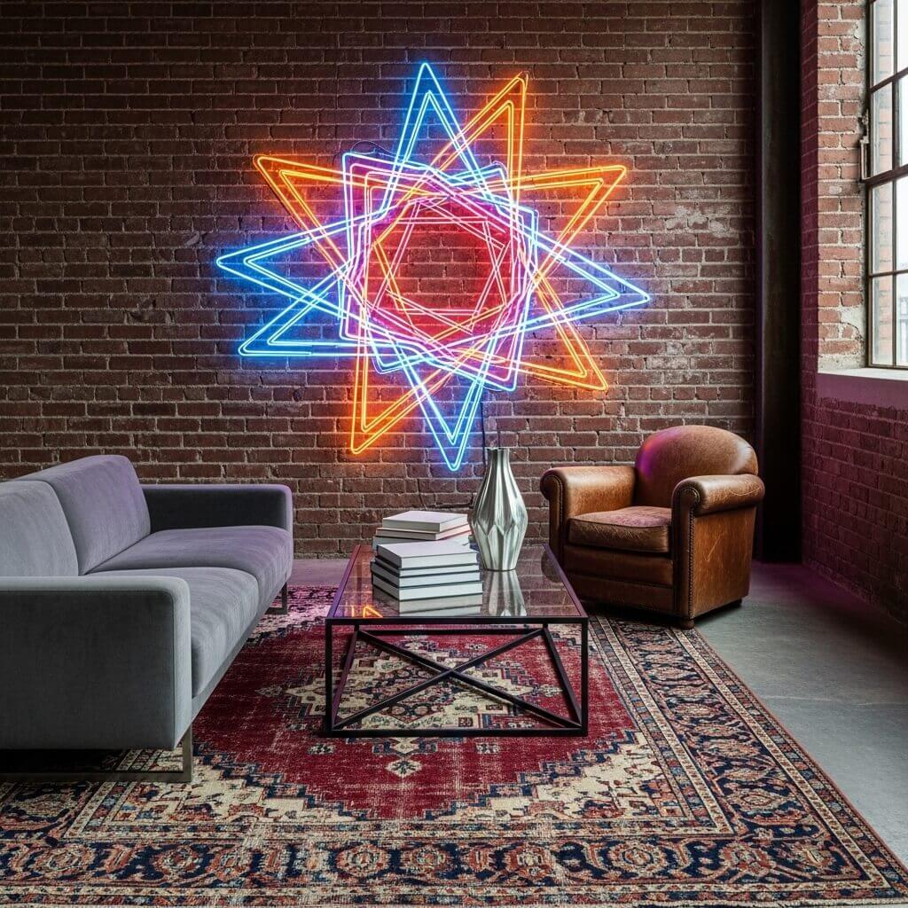 I placed a flashy, modern neon sign right above my oldest antique floor rug, and it looks unbelievably cool.