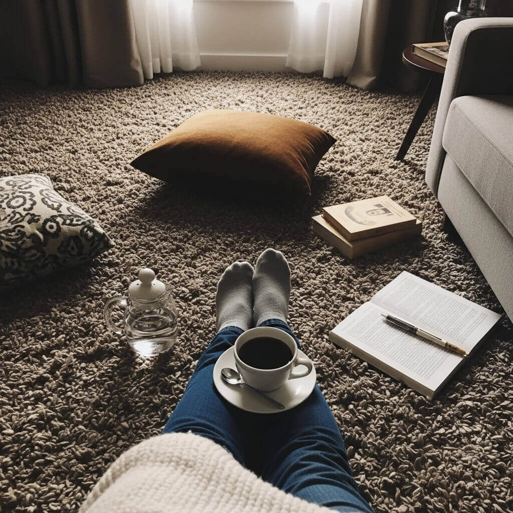 I brew a hot cup of black coffee and literally sit on my layered floor instead of the couch.