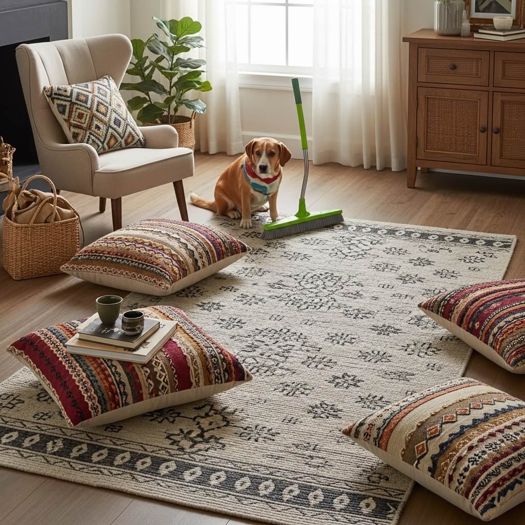 - Toss a few massive oversized floor pillows directly onto the soft layered rugs.