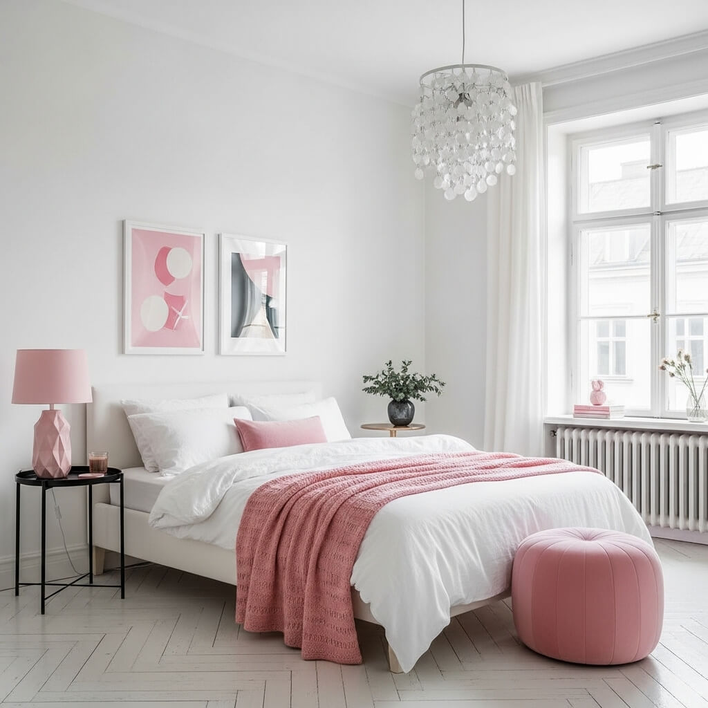 • The Visual Impact: White resets the eye. It makes black, pink, and blue accents pop, ensuring they feel intentional and vibrant. This approach keeps the room airy and bright, ideal for Pinterest-worthy images.