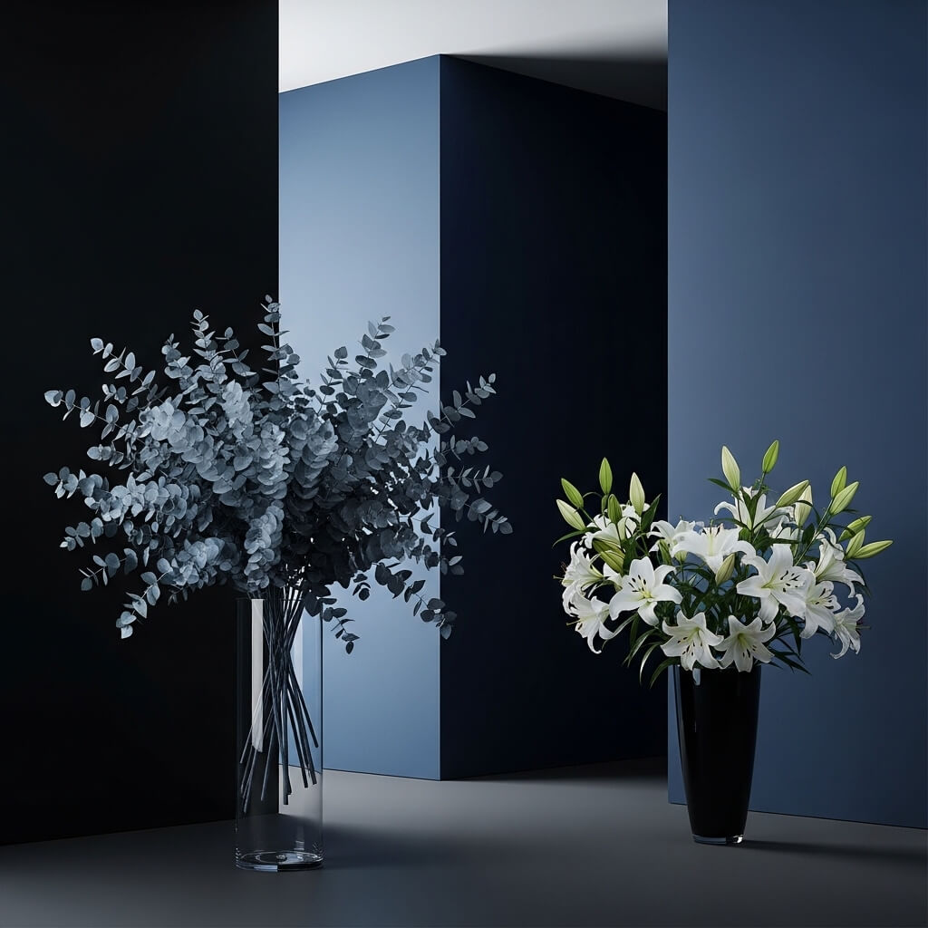 • The Approach: Keep it dramatic. Choose a single large clear vase with dried eucalyptus (which dries silver-blue, meeting Blue) or fresh white lilies in a black vase. These organic touches balance the black architecture and color blocking.