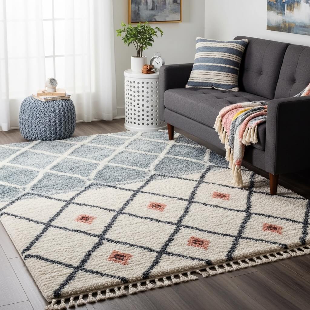 • Option B (Warm Balance): A Moroccan-style shag rug in creamy white (White) with thin charcoal (Black) and dusty terracotta (Pink) patterns ties the palette together.