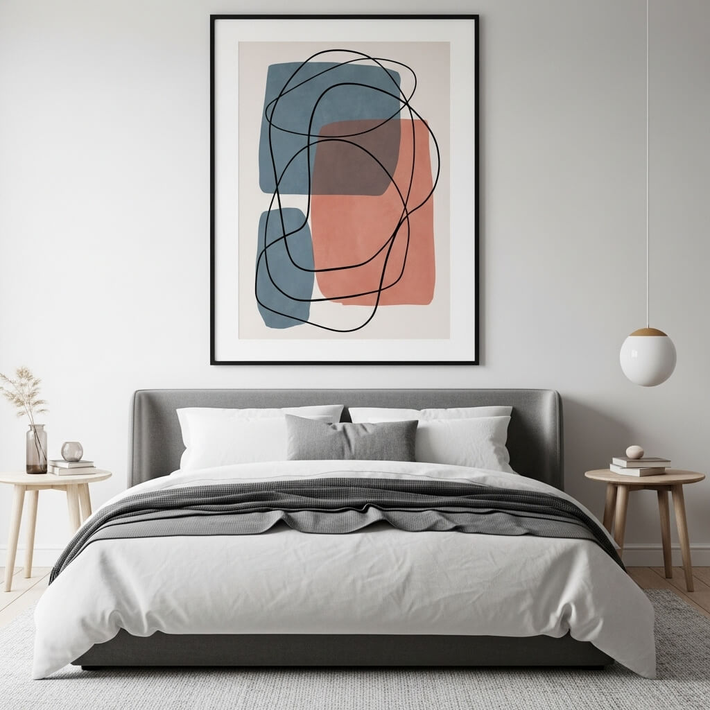 • The Art Selection: Pick abstract or minimalist art. Look for pieces that use negative space well. A large painting with dusty blue and terracotta pink, outlined in black ink, makes a great centerpiece above the bed.