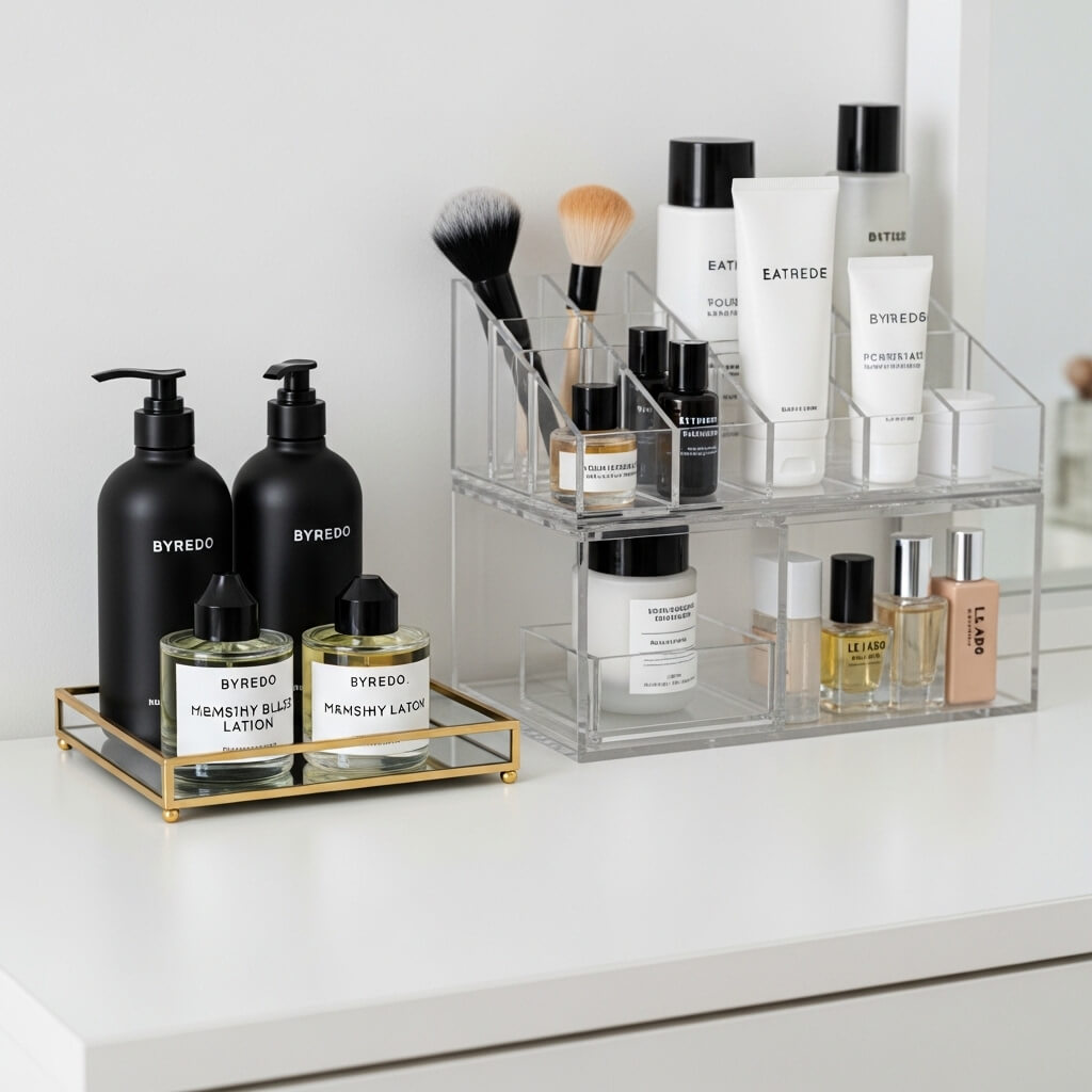 • The Organization: Use a simple white or light-wood vanity desk. Organize products with clear acrylic dividers.