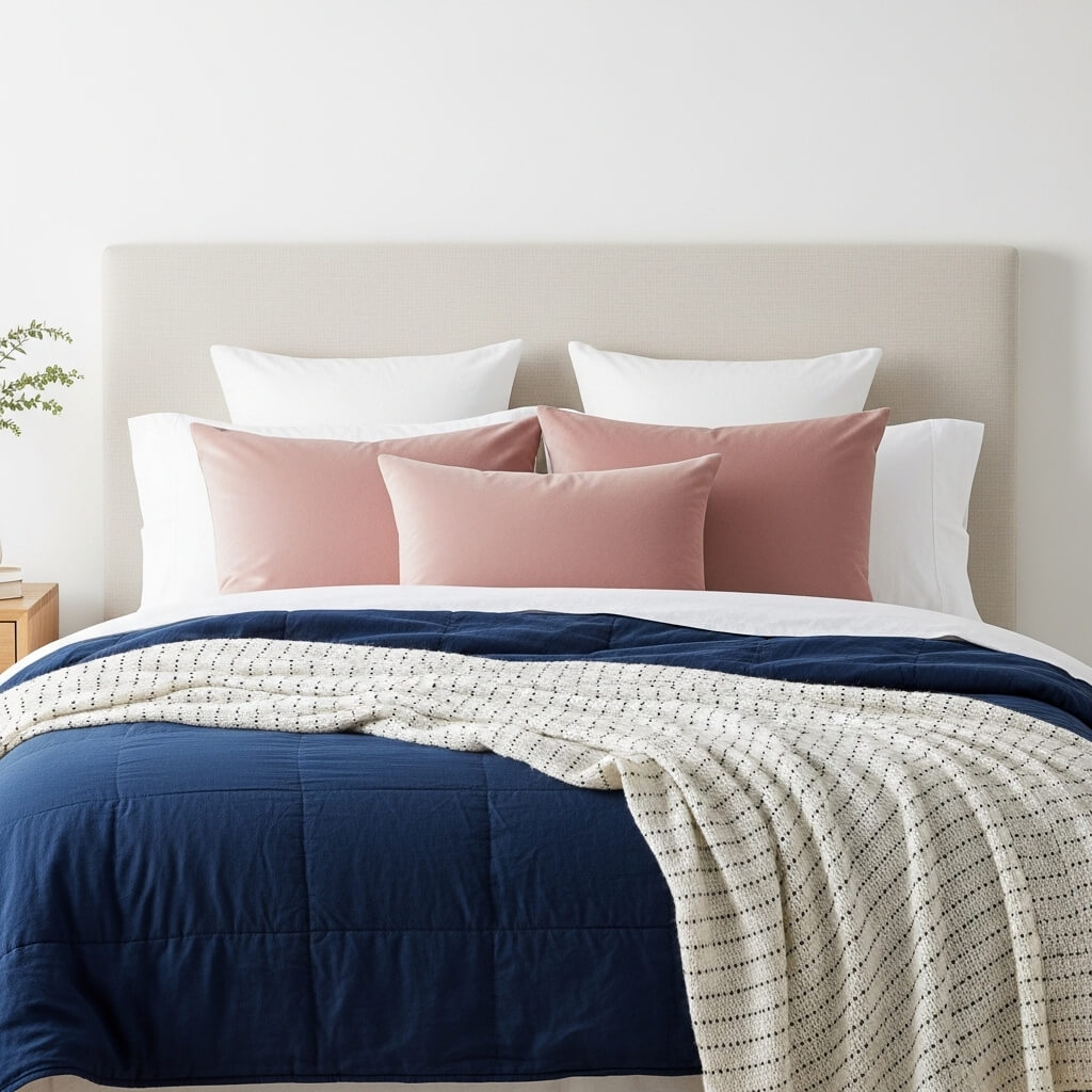 • The Layering Strategy: Start with white linen. Add a heavy navy blue quilt at the foot (Blue). Toss in two dusty rose or blush velvet pillows (Pink) in front of your white pillows. Finally, drape a thin, chunky knit white blanket with a subtle black line pattern (Black/White) over the duvet. This layering meets color needs while focusing on comfort and texture.