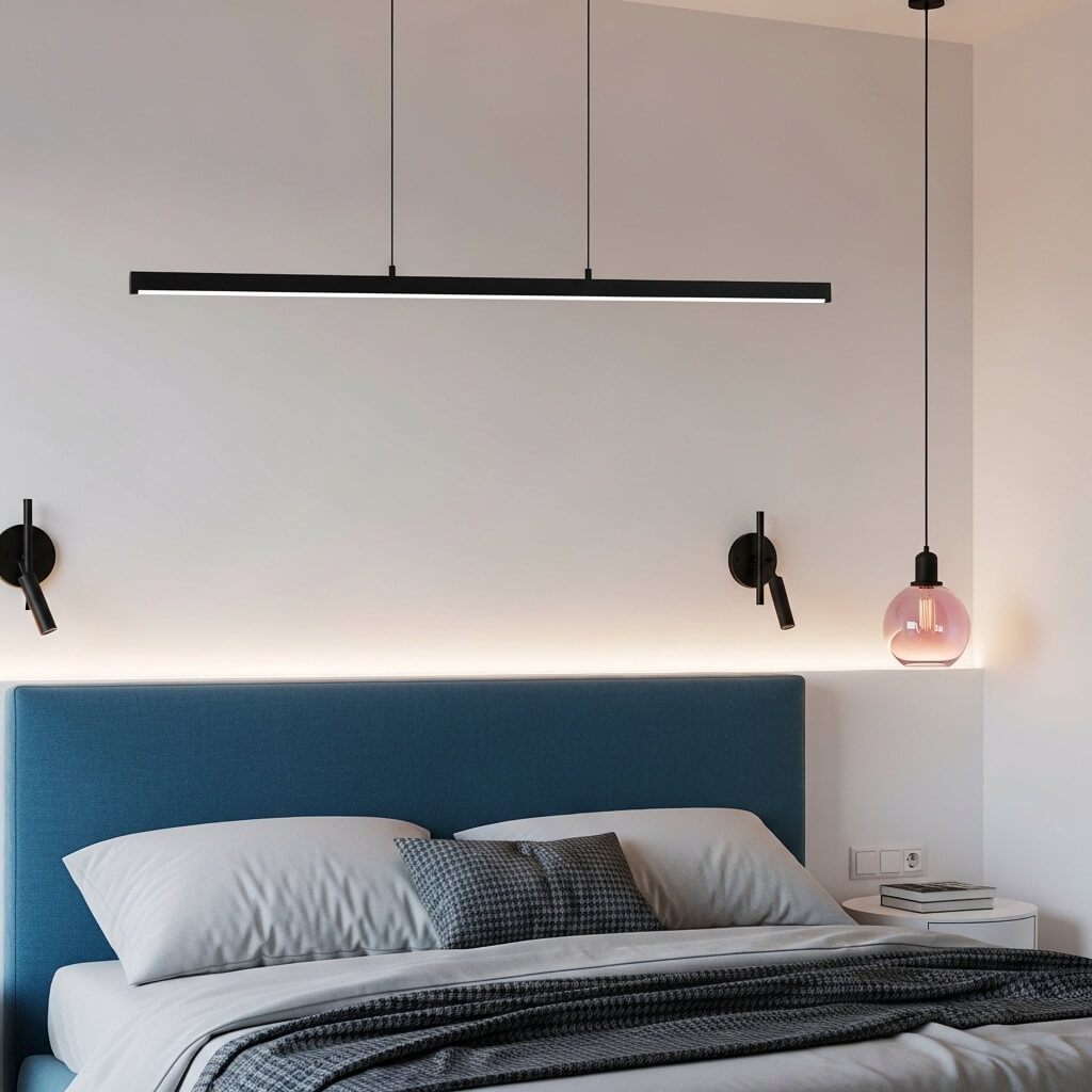 • The Fixtures: Choose light fixtures with matte black hardware. A linear black pendant light above the bed or minimalist wall sconces free up space and add style.
