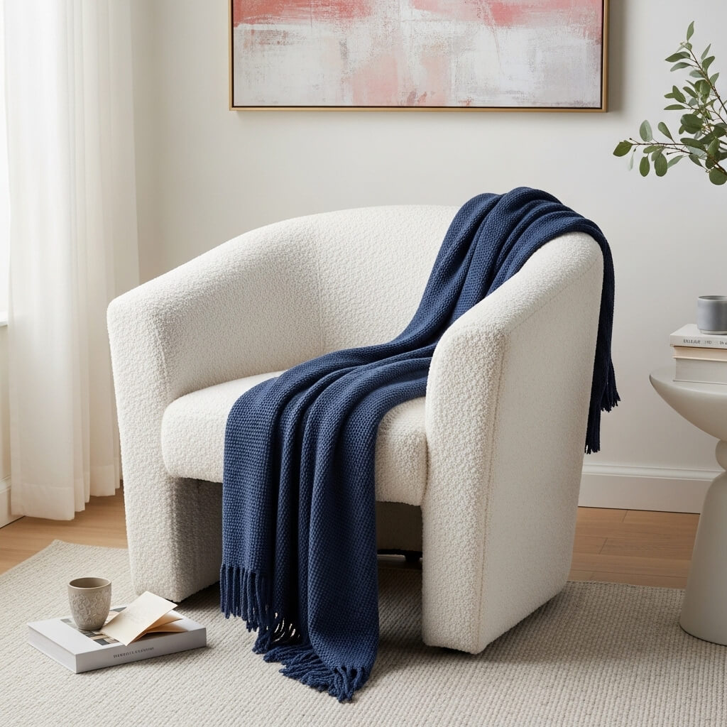 • The Accessory: Drape a navy blue throw blanket (Blue) over the arm. Add a small side table nearby. This corner balances the softness of white and pink with the depth of blue while looking inviting.